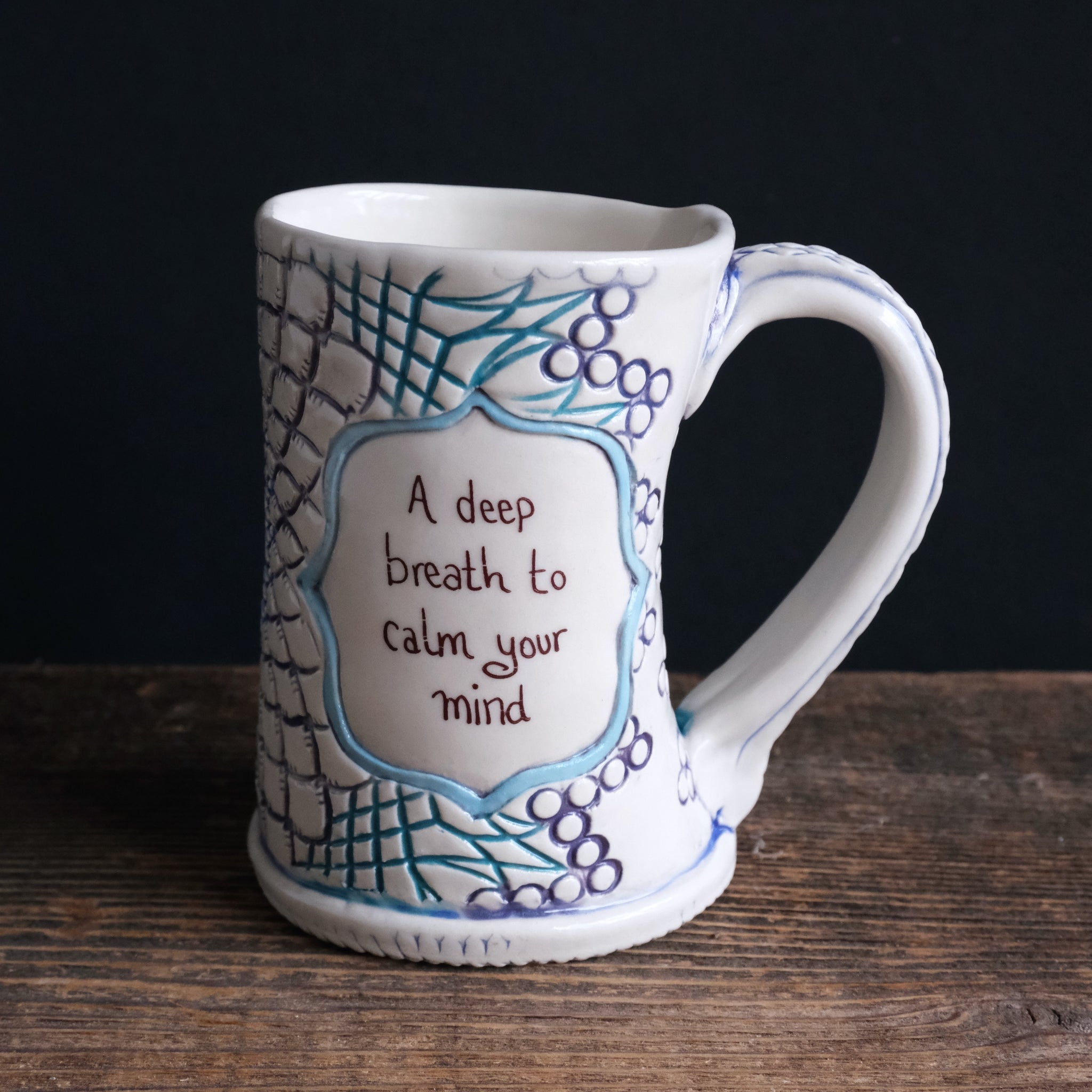 Each Celebration Mug in our Shape of Change collection is hand-built from porcelain slabs, textured with lace, and hand-painted. These vibrant, maximalist mugs carry their own inscription—meaningful or gently irreverent words fired permanently into the glaze. The text comes from decals we design and print in our studio, then fire to nearly 2000°F, ensuring the words never fade, peel, or wash away.